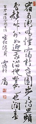 絖本肉筆・・縦134cm、横42cm 「靄軒廉」の下に、陰刻「靄軒」と陽刻「仲小路廉」 の落款が押されている。仲小路靄軒は山口の人 で、名は廉、号を靄軒と称し、判検事試験合格後 に検察官や判事を歴任し、次いで官僚となり更に 国会議員へと転じ、大正元年の桂内閣で農商務 大臣に就任した政治家で、勅撰の貴族院議員や 枢密顧問官も拝している。尚、歴史哲学者の仲小 路彰は、彼の次男である。亦彼は「大東文化協会 」の初代理事でもある。 |