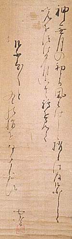 紙本肉筆・・縦89.5cm、横25cm 「也有」の下に、陽刻「也有」の落款が押されてい る。横井也有は尾張の人で、名は時般、字は伯 懐、号を也有(俳句)・螻丸(狂歌)・蘿隠(漢詩)・ 暮水(和歌)などと称し、尾張藩の大番頭兼御用 人や寺社奉行などを勤めた名門武家であるが、 漢学を小出トウ斎に、俳諧を太田巴静らに学び、 53歳で致仕した後は風流の生活に入った、多趣 味多芸で知られた俳人である。俳文集に『鶉衣』、 連句集に『蘿葉集』、漢詩文に『蘿隠編』、狂歌集 に『行々子』等が伝わっている。 |