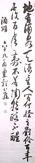 紙本肉筆・・縦139cm、横33.3cm 「六十九翁栗谿藏」の下に、陰刻「橋本蔵印」と「家 在栗溪」の落款が押されている。橋本栗谿は鳥取の 人で、名は好藏、号を栗谿と称し、東京帝大文科古 典講習科漢書課を卒業後、愛媛県の中学校に奉職 (この時、夏目漱石と同僚になる)し、その後山口高 等商業学校の教授となった漢学者で、夏目漱石の 『坊ちゃん』に登場する、「漢学者の先生」のモデル である。その書は、雄渾を以って知られている。 |