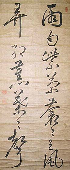 紙本肉筆・・縦133.4cm、横56.3cm 陰刻「大岡忠相」と陽刻「朝散大夫之章」の落款が押されてい る。大岡越前守は江戸の人で、名は忠相、旗本大岡忠高の 三男で、10歳の時に同族大岡忠真(奈良町奉行)の養子とな り、26歳で御書院番として出仕し、以後御徒頭・御使番・御目 付と出世して能登守となり、36歳で天領伊勢山田の山田奉 行となり、更に40歳で江戸に帰任して普請奉行を拝して越前 守となり、翌年の41歳の時に江戸南町奉行に移り在職19年 間、次いで寺社奉行に在ること15年間、江戸市中行政に携 わること実に34年間の長きに渉り、その間町火消しの設置 や小石川療養所の創立など、八代将軍吉宗の享保の改革を 支えた幕臣で、晩年には一万石を加封されて、三河大平の大 名西大平藩主となり、彼の子孫は代々藩を継いで明治に至っ ている。尚、九代将軍家重の側用人として活躍した大岡忠光 (岩槻藩主)は、彼の遠戚に当る。 |