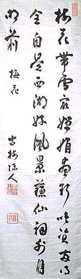 絹本肉筆・・縦144.5cm、横44cm 「古梅陳人」の横に陰刻「康文之印」と陽刻「浩潮」の落 款が押されている。宮小路浩潮は筑前の人で、名は康 文、号を浩潮・古梅などと称し、嘉永年間(1848〜185 2)に比叡山で天台の学を修め、権大僧正となって帰郷 し、太宰府で菅公廟の祭酒となり、大阿闍梨・大和尚に 進むも還俗した人で、幼少より晋唐以来の諸名家や我 が国の名筆を学び、特に空海の書法を究めた名筆家と して知られた書家で、平安遷都1100年記念祭には特 に下命に因って、平安神宮応天門の扁額を揮毫している し、また明治28年に建碑された富岡神社の横綱力士碑 の揮毫も行っている。 |