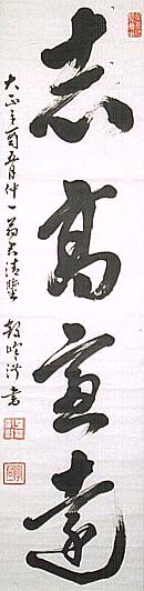 紙本肉筆・・縦127.4cm、横31.2cm 「鶴峰淑書」の下に、陰刻「平沼淑郎」と陽刻「字 君一」の落款が押されている。平沼鶴峰は津山の 人で、名は淑郎、字は君一、号を鶴峰と称し、平 沼騏一郎の兄にして平沼赳夫の曾祖父である。 初め津山の斎藤淡堂に『四書』や『詩経』を学び、 東京に出て小石川の広瀬惟煕に漢学を学び、東 京帝大卒業後は岡山の師範学校教頭などを経て 、早大教授となり更に第三代早大学長となった人 で、経済学者にして法学博士である。因みに、彼 は大東文化学院創設期の、法学・経済学担当の 教授でもある。 |