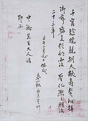 紙本肉筆・・縦24cm、横18cm 松平春嶽は江戸の人で、名は慶永、号を春嶽と称し、 徳川御三卿田安斉匡の八男で、福井藩主松平斉善の 嗣子となり、幕末の藩政改革に尽力した大名で、幕末 四賢侯(松平慶永・島津斉彬・伊達宗城・山内豊信)の 一人と称されている。「春嶽永未是草、中洲先生大人 請」と有る。これは、「未だ是さざるの草」であれば、春 嶽が三島中洲に自作の漢詩の添削を依頼したもので あろう。詩文の結句に「明治二十三年」とあり、一方日 付が壬午元旦(明治十五年)とあり、一見矛盾している 様に見受けられるが、これは、明治天皇が皇太子と成 られた万延元年(1860)から数えて「明治の二十三年 間」と言うことであり、何ら壬午元旦と矛盾しない。実に 面白い資料である。 |
