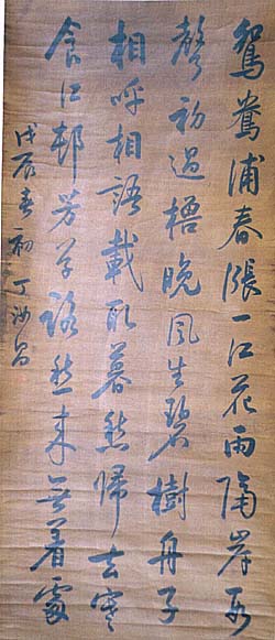 絹本肉筆・・縦130cm、横56.5cm 丁汝昌は字を禹廷と言い、安徽省の人で、清 朝末期に海軍提督として北洋艦隊を統率した 軍人であるが、日清戦争で敗れ、服毒自殺し ている。「戊辰春初」と書かれていれば、同治 七年(1868)の作と言うことになる。文字数 は、「鴛鴦浦春漲一江花雨隔岸形聲初過櫓 晩風生碧樹舟子相呼相語載取暮愁帰去寒食 江邨芳草詠愁來無着處」の45字であれば、 詩ではないようである。 |