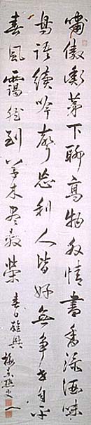 紙本肉筆・・縦131cm、横30.5cm 「梅東樵史」の下に、陰刻回印の「清敬直印」と陰刻 「清氏其正」の落款が押されている。山田梅東は京 の人で、名は敬直、字は其正、号を梅東・松桂などと 称し、詩文を善くして梁川星巌らと交流を持った儒者 で、洛南の石清水八幡の祝も勤めており、晩年には 「清氏」を名乗ることも多い。(嘉永五年版『平安人物 志』には、それ以前の「山田氏」ではなく、「清氏」で記 載されている)。また彼は、南画家の鈴木松年の漢 詩文の師でもある。 |