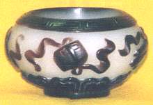 | 高さ3.5cm、口径4cm、胴径6cm、底径2.9cm 所謂「乾隆硝子」の水盂である。白濁の硝子 の上に暗赤色硝子(エンジ色の赤の為、遠 目は一見ダークブルーに見える)を載せ、口 淵の雷紋(青銅器に見られる紋様)・胴体の 四宝(琴・棋・書・卷)・底部の蓮弁紋が削り 出されている。色調や硝子の質感は、道光 時代から清末にかけての様相を示している が、或いは民国時代の倣品の可能性が無い 訳では無い。博雅の士のご教授を切に待つ ものである。 |