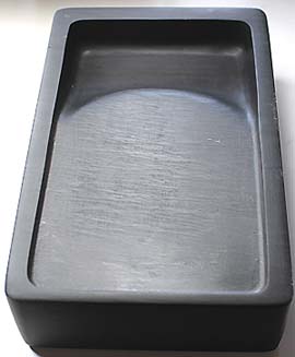 龍尾石を長方硯に仕立てたもので、南唐の 李氏が推奨してより、一世を風靡するよう になった石で、石色は青灰・黒灰・青黒を基 調とし、端渓と双璧を為す硯石である。 歙州硯は、江西省婺源県の龍尾山脈から 産出される石で、嘗て安徽省黄山市歙県を 中心とした歙州の一部であった為、一般的 に歙州硯(確かに昔は、安徽省歙県産の硯 石が有った)と称するが、正確には龍尾硯 である。 本品は、漆黒に近い黒灰色で、陸・海共に 羅紋が入っている。 尚、龍尾硯は江西四大名硯(婺源の龍尾 硯・石城の石城硯・廬山の金星硯・修水の 貢硯)の一つでもある。 |