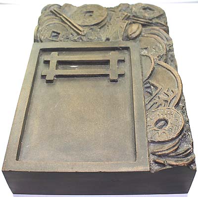| 縦16cm、横11.3cm、厚さ3cm 硯縁外に古錢紋様を彫り込み、硯部分は、井形の海を設け、 何処か俗っぽい感じもする長方硯であるが、墨の下りは宜し い。 本品は、所謂澄泥陶硯ではなく、一時期一般的に流布した江 蘇省蘇州付近の霊巌山産出の石で、俗に蘇州澄泥石硯(正 確には、霊巌山石硯と言う可きであろう)と称する石硯で、やや もすると、山西省新絳県の所謂絳州澄泥黄色陶硯と混同し易 い。絳州澄泥黄色陶硯は、NO579を参照されたし。 |