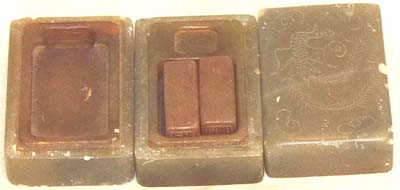 小硯・印合子とを重ねた重箱形の灰白玉の硯で、軟らかい軟玉質であり、同形の方形玉印二本