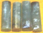 中国では古代より死者を玉で覆う風 習が有り、死体全体を覆うのが玉衣 で、復活を願って死者の口に含ませ るのが玉含蝉で、死後の食料に困ら ぬ様に両手に握らせるのが玉握豚 である。それ以外にも悪霊の死体へ の進入を防ぐ為に、人体の孔と言う 孔(耳・鼻・肛門・性器等)を塞ぐのが 玉塞(上小下太の棒状)であり、大 概角柱か円柱の形態をしている。本 品は、その八角柱塞四本である。 |