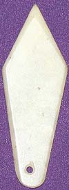 | 高さ6.2cm、肩幅2.2cm、底幅0.9cm、厚み0.85cm 白玉の小圭である。圭は既に商代から見られ、 大概20cm前後の品が多く、一般的には頭頂部 が平らな平頭・折肩・平底で、一穴乃至は二穴 であるが、漢代に至ると、頭が尖った尖頭・折肩 ・平底の形態が現れ出し、小型の品も見られ出 す。山東省からは、長さ9.2cmの青玉圭が出 土している。本品は、尖頭・折肩・平底・一穴で はあるが、純粋な板ではなくやや丸味が有り、 清朝頃の品と思われる。 |