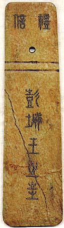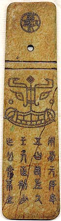 | 長さ31.8cm、上幅.7.2cm、下幅8.5cm、厚み0.4cm 一応材質は「玉」である。右側饕餮紋の左歯下に 微かに見える緑色は灰玉の原石である。但し、物 は現代工芸品と言うよりお土産品である。玉板で この様な形態をしたものには、「玉戈」「玉刃」「玉 笏」「玉冊」などが有るが、「玉戈」「玉刃」は、上部 に穴が有り下部は薄くなっており、模様は彫られ ても文字は彫られない。「玉笏」は、穴が有り時に は文字も彫られるが、その部分を持つため持った 時に文字が読めるようになっている。「玉冊」は、 長方形で穴は無く文字が彫られている。つまり本 品は、それぞれの部分的要素は有るものの全く 別物で、まさにお土産品である。この様な圭笏は 2000年前後から市場に登場し、彭城王のみな らず「某某王」と刻された品を多数散見する。共に 金泥象嵌である点は一致しているが、獣面や篆 書の文内容に、微妙な違いが有る。この様なお土 産品は、古玉市場から既に淘汰されたものと思っ ていたが、今(2010)に至っても堂々と古玉とし て市場に登場しているのは、驚きであり且つネッ ト上で真偽の論議が交わされる事自体が情けな い。金象嵌ではなく金泥象嵌である一事を以って しても、古い訳は無い。 左側は、上部に「禮信」・中央に「彭城王之圭」、 右側は、上部に上下に「福代」左右に「五五」・下 部に「用賜方厚卒、五曰司左闕、王方正刑少、作 公余不止」と、金泥が象嵌されている。 |