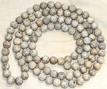 表面が殆ど白色化しているが本来は青玉の珠である。 旧蔵者は唐代の朝珠と伝えるが、数珠に過ぎない。朝 珠とは、仏教の数珠から発展した清朝の官服飾りで、文 武官僚(文官五品・武官四品以上)が、朝廷の公式服装 である朝服を着た時に、身につける飾りであり、数珠の 途中に飾りの珠を左右に垂らすのが一般的で、数は百 八を越える。本品は、形態が異なり、百八個であり、し かも唐墓出土と伝えられていれば、明らかに仏教の数 珠である。 |