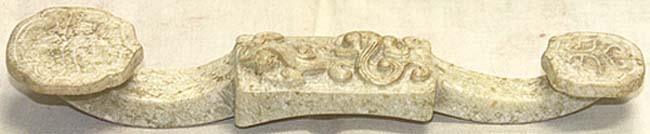 雜玉に近い玉質であるが、一応白玉であり、如意頭に獸面の線刻紋様が、中央に雨龍の浮彫紋様