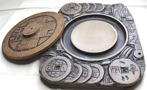 | 縦21cm、横17.5cm、厚さ3.5cm 円形の墨堂以外は、硯縁の四周及び背面・蓋まで古錢紋様を彫り込んだ、山 西省新絳県の所謂絳州澄泥黄色長方陶硯で、甚だ俗っぽい感じがする。 本品は、現在一般的に流布している江蘇省蘇州付近の霊巌山産出の石で、 所謂蘇州澄泥石硯(正確には、霊巌山石硯と言う可きであろう)と称する石硯 (NO169を参照)ではなく、古来より真しやかに言われていた、汾河の水を 細かく濾過した泥を固めて特殊な漆喰とし、其れを彫刻造形し、燃焼して作り 上げた陶硯で、所謂絳州澄泥硯(陶硯)と称される、山西省新絳県の伝承的 な澄泥陶硯である。現在の澄泥陶硯は、燃焼時間の差異に因り、色調が茶 色から黒色まで多様である。亦た山西省には、同じ澄泥陶硯である忻州五台 県の五台山澄泥陶硯も有る。 澄泥陶硯には、代表的な産地が三カ所有り、山西省の絳州澄泥陶硯・河南省 の虢州澄泥陶硯・山東省の魯柘澄泥陶硯である。 尚、陶硯としては、江蘇省宜興の紫紅砂を用いた紫紅陶硯も有る。 |