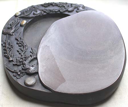 | 縦15.4cm、横13.1cm、厚さ2.1cm 上縁から左縁にかけて伝統的な喜鵲登梅の紋様を刻し、海も左上部に 掘られた楕円硯である。 本品は、石質・眼・紋様等から、梅花坑と思われる。 端州を産地とする端渓石は、硯石として唐代から知られ、宋代から量 産され、石色は紫を基調とし、歙州石と並んで、硯石の双璧をなしてい る。端渓の坑としては、老坑水巖・坑子巖坑・麻子坑・宋坑・梅花坑(沙 浦典水村)等が有名で、他には穀[・古塔巖・宣徳巖・朝天巖・白線巖 等が有るが、現在では採石されておらず、今では殆どが沙浦坑の石を 加工したものである。 |