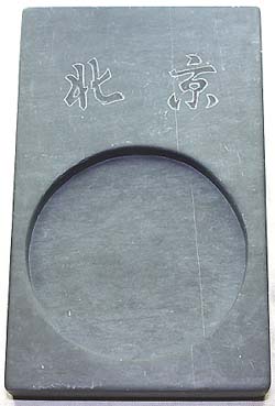 長方硯と言う可きか、円硯と言う可きか、 眉仔紋様が見られれば、孰れにしても歙 州硯である。南唐の李氏が推奨してより 一世を風靡するようになった石で、石色 は青灰・黒灰・青黒を基調とし、端渓と双 璧を為す硯石である。 本品は、下部に円形の墨堂を配した長 方硯であるが、何故か上部に北京と掘ら れている。 歙州硯は、江西省婺源県の龍尾山脈か ら産出される石で、嘗て安徽省黄山市歙 県を中心とした歙州の一部であった為、 一般的に歙州硯(確かに昔は、安徽省 歙県産の硯石が有った)と称するが、正 確には龍尾硯である。 尚、龍尾硯は江西四大名硯(婺源の龍 尾硯・石城の石城硯・廬山の金星硯・修 水の貢硯)の一つでもある。 |