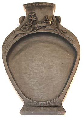 玉山の細羅紋石を瓶型の硯に仕立てたも のである。羅紋とは石の紋様で、以前は江 西省婺源の龍尾山で採石されていたが、最 近は同じ江西省上饒の玉山で採石される石 が、廉価な細羅紋硯と称して売られている。 歙州硯は、江西省婺源県の龍尾山脈から 産出される石で、嘗て安徽省黄山市歙県を 中心とした歙州の一部であった為、一般的 に歙州硯(確かに昔は、安徽省歙県産の硯 石が有った)と称するが、正確には玉山硯 である。 本品は、其の玉山石の壺様硯である。 |