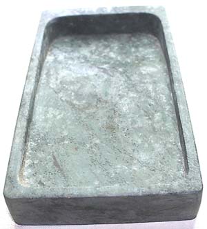 | 縦13.8cm、横7.7cm、厚さ2.1cm 遼寧省本渓の橋頭鎮で産出する石で、所謂遼 硯と称するものである。遼硯は伝統的に線彫り を特徴とするが、現在では透かし彫りや立体彫 りも行われている。橋頭鎮石は、其の色調が多 様で、灰色・緑色・紫色・黄色等である。 本品は、灰色と緑色が混じり合った色調で、無 紋の実用硯である。 吉林省の松花江石と遼寧省の橋頭石とは、共に 本渓産出の石ではあるが、吉林の方は横縞の 緑色を基本とし、遼寧の方は、緑色と紫色或は 緑色と黄色とが混じり合っている。共に清朝以来 の硯石ではあるが、色調の相違から松花江石 の方を上に見る傾向が強い。 |