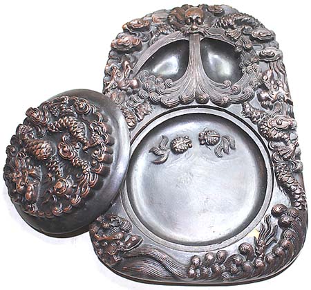 河南省洛陽新安県で作られている澄泥陶硯で、伝統的に茶色を基調 とし、所謂虢州澄泥硯と称されるものである。 本品は、墨堂の上部に二匹の金魚、墨堂の周囲に雲と龍四匹、蓋に 龍一匹が施されている。背面には「墨寶齋」の銘が刻されている。 澄泥陶硯には、代表的な産地が三カ所有り、山西省の絳州澄泥陶硯 ・河南省の虢州澄泥陶硯・山東省の魯柘澄泥陶硯である。 尚、陶硯としては、江蘇省宜興の紫紅砂を用いた紫砂陶硯も有る。 |