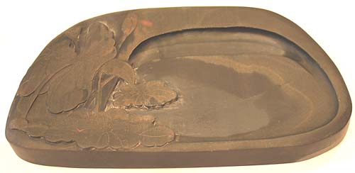 | 縦13cm、横22.5cm、厚さ2cm 硯の左側に蓮葉の紋様が彫られた横型の楕円硯である。最近この様な彫刻 を施した歙州硯を、良く見かける様になった。歙州石は南唐の李氏が推奨し てより、一世を風靡するようになった石で、石色は青灰・黒灰・青黒を基調 とし、端渓と双璧を為す硯石である。 歙州硯は、江西省婺源県の龍尾山脈から産出される石で、嘗て安徽省黄山 市歙県を中心とした歙州の一部であった為、一般的に歙州硯(確かに昔は、 安徽省歙県産の硯石が有った)と称するが、正確には龍尾硯である。 尚、龍尾硯は江西四大名硯(婺源の龍尾硯・石城の石城硯・廬山の金星硯・ 修水の貢硯)の一つでもある。 |