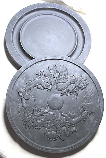本品は、蓋に双龍紋が彫られ、蓋にも墨堂にも所謂金
