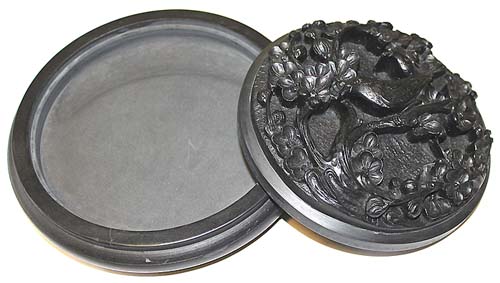 本品は、蓋に喜鵲登梅紋様が立体彫りされた、峡石硯であるが、惜しい事に