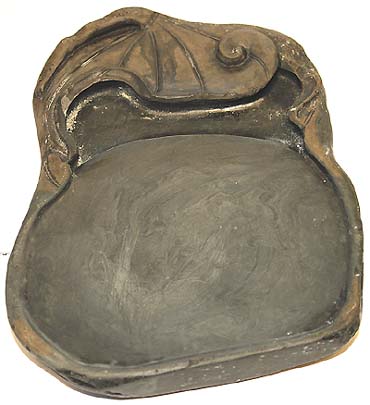 上縁部分に蓮葉紋様を彫った硯で、緑色と灰色の二層が