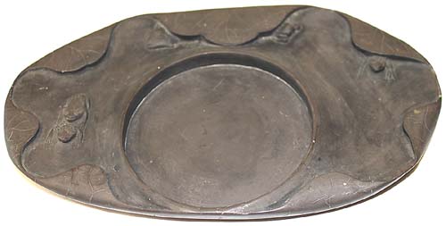 全体に蓮葉紋様を刻し、中央に円形の硯面を施し、周囲に魚・蛙・蓮葉を施し
