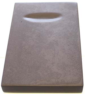 | 縦16.5cm、横11cm、厚さ2cm 遼寧省本渓の橋頭鎮で産出する石で、所謂遼 硯と称するものである。遼硯は伝統的に線彫り を特徴とするが、現在では透かし彫りや立体彫 りも行われている。橋頭鎮石は、其の色調が多 様で、灰色・緑色・紫色・黄色等である。 本品は、紫色と灰色の二層の色調で、上部に海 を設けただけの板硯で、硯面は紫色で背面は灰 色である。 吉林省の松花江石と遼寧省の橋頭石とは、共に 本渓産出の石ではあるが、吉林の方は横縞の 緑色を基本とし、遼寧の方は、緑色と紫色或は 緑色と黄色とが混じり合っている。共に清朝以来 の硯石ではあるが、色調の相違から松花江石 の方を上に見る傾向が強い。 |
