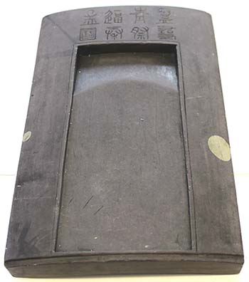 上縁部分に篆書の文字が刻された長方硯であるが、背