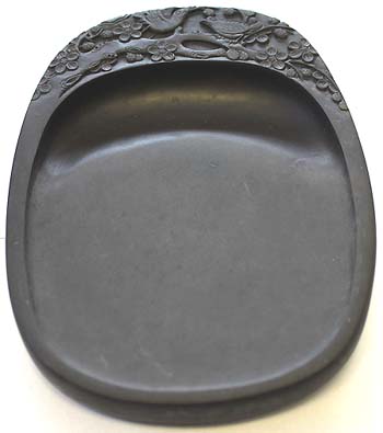 | 縦16.5cm、横13cm、厚さ2.5cm 上縁部分に伝統的な喜鵲登梅の紋様を刻した、小さい 楕円硯である。 端州を産地とする端渓石は、硯石として唐代から知られ 、宋代から量産され、石色は紫を基調とし、歙州石と並 んで硯石の双璧をなしている。 端渓の坑としては、老坑水巖・坑子巖坑・麻子坑・宋坑 ・梅花坑(沙浦典水村)等が有名で、他には穀[・古塔 巖・宣徳巖・朝天巖・白線巖等が有るが、現在では採石 されておらず、今では殆どが沙浦坑の石を加工したもの である。 |