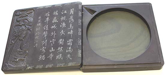 本品は、正方形の面に片口を付けた丸い墨堂が彫られており、蓋には、龍紋様と楓