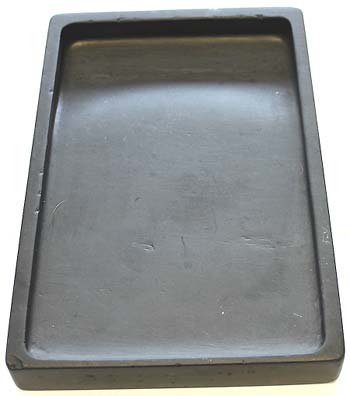 龍尾石を大型の長方硯に仕立てたもので、南唐の李氏 が推奨してより、一世を風靡するようになった石で、石 色は青灰・黒灰・青黒を基調とし、端渓と双璧を為す硯 石である。 歙州硯は、江西省婺源県の龍尾山脈から産出される石 で、嘗て安徽省黄山市歙県を中心とした歙州の一部で あった為、一般的に歙州硯(確かに昔は、安徽省歙県 産の硯石が有った)と称するが、正確には龍尾硯であ る。 本品は、青灰色に近い黒色で、陸・海共に羅紋が入って いる。 尚、龍尾硯は江西四大名硯(婺源の龍尾硯・石城の石 城硯・廬山の金星硯・修水の貢硯)の一つでもある。 |