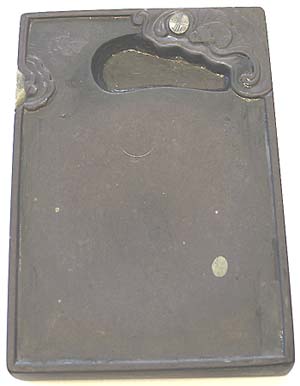 上縁部分に蝙蝠紋様が刻された長方硯である。