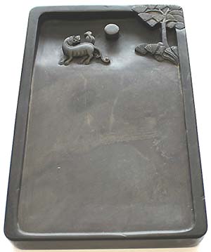 海の部分に松樹と鳥獣紋様が彫られた長方硯