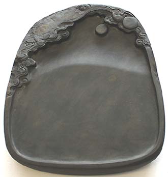 上縁部分に雲紋様が刻された、有眼の楕円硯であ