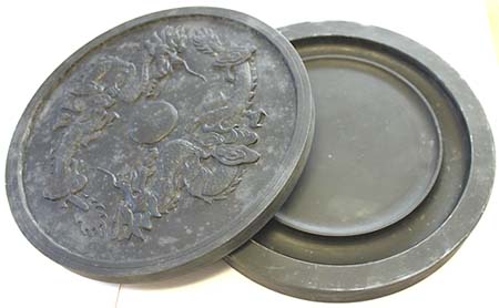 本品は、蓋に双龍紋が彫られ、蓋にも墨堂にも所謂金星が見られる。