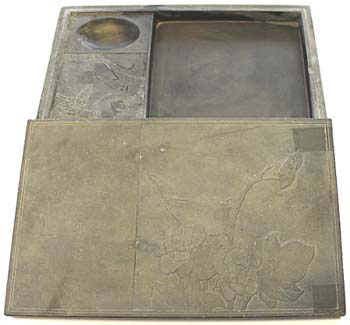 部に墨堂を設けた横長方硯で、蓋は、右に花鳥紋様、