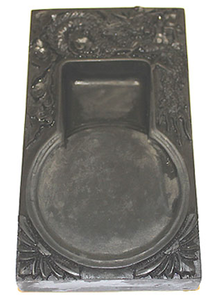 丸い墨堂と四角な海、其の上部に龍紋様が彫