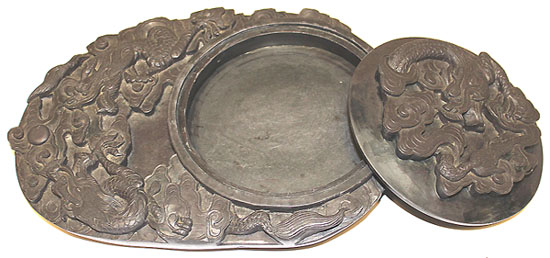 北京の潭柘紫石を硯に仕立てた工芸品である。硯の上部に龍と雲を、蓋に龍の紋様