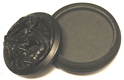本品は、蓋に龍紋様が立体彫りされた、峡石硯である。