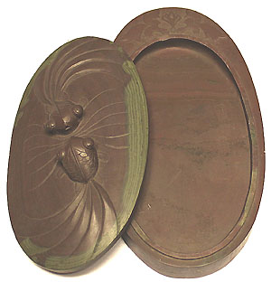 蓋に二匹の金魚を立体彫りした楕円硯である。
