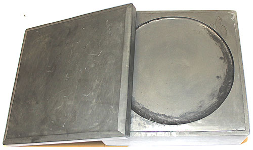 中央に丸い墨堂と片口を設けた、有蓋の正方硯である。