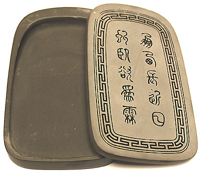 蓋に篆文十字が刻された無紋の楕円硯である。
