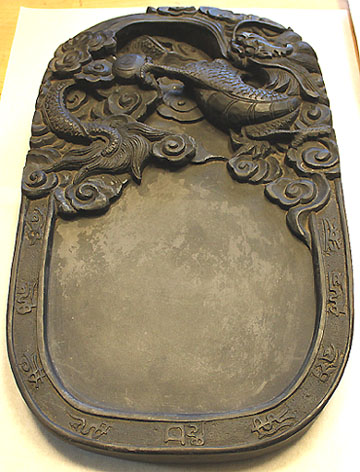 上部に雲龍紋様が刻された楕円硯で、背面には文章が
