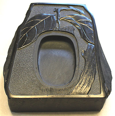 本品は、樹葉紋様が刻され、楕円の硯面が彫られているが、
