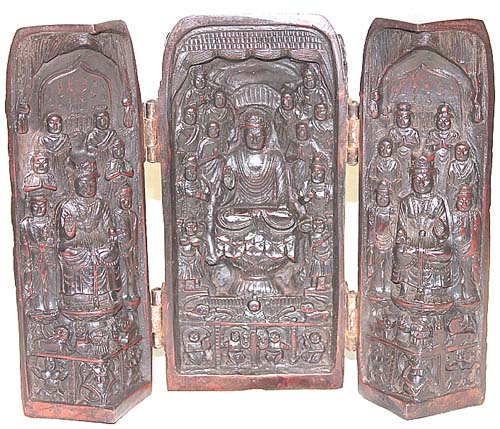 観音開きの仏龕で、左右・中央共に多くの仏像が刻されている。左右を閉める