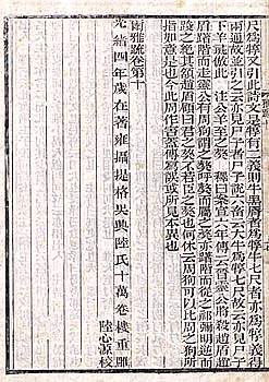 | ここに提示する書籍は、清朝の大蔵書家陸心源が己の書室十萬卷樓に集めた、南宋初期紹興年間(1131〜1161)に杭州地区で刊行され、その後元・明初の逓修を歴した南宋本『爾雅疏』十卷本(現在、静嘉堂文庫が所蔵)を、清末光緒四年に陸心源自身が重雕校刊した、『重校南宋本爾雅疏』で、呉昌石の序文が有る。しかし、残念なことに重雕本とは言え、本来の宋版の字樣に比べて雅味の無さは如何ともし難い。 |