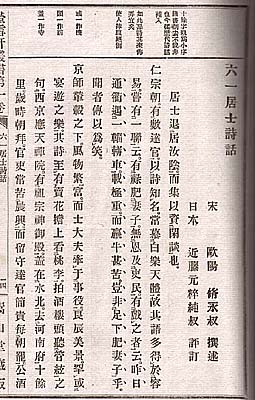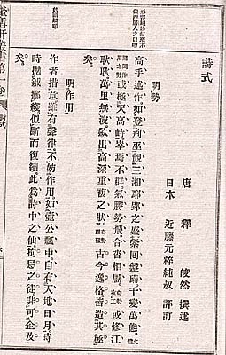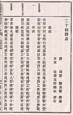 | 『螢雪軒叢書』とは、近藤元粋が明治二十五年に出版した叢書で、中国の歴代の詩話五十九種に返り点を付し、合わせて近藤の評定を加えた和装本で、司空図の『二十四詩品』・歐陽修『六一詩話』・朱承爵の『存余堂詩話』等が、収められている。近藤には、他にも論画関係の書を同様な形態で出した『蛍雪軒論画叢書』六冊も有る。彼は、明治期に多くの漢籍に訓点を付けて出版した人で、その書は當時廣く流布している。尚、彼自身の蔵書は、現在大阪天満宮御文庫に収められている。 |